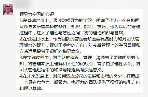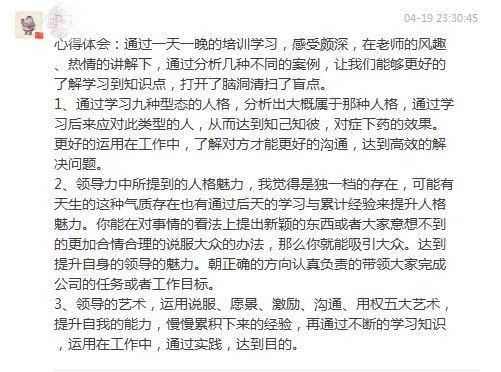 培訓(xun)結束后(hou),大家(jia)紛紛主動分享自(zi)(zi)己(ji)(ji)(ji)本(ben)次(ci)學(xue)習(xi)心(xin)得(de)。這(zhe)是今年新晉升會展招商部副部長的(de)(de)(de)(de)周鵬(peng)第一次(ci)參加類似(si)培訓(xun),在(zai)(zai)談及自(zi)(zi)己(ji)(ji)(ji)的(de)(de)(de)(de)學(xue)習(xi)心(xin)得(de)時,心(xin)存感恩,他(ta)(ta)說自(zi)(zi)己(ji)(ji)(ji)通(tong)過這(zhe)次(ci)培訓(xun),開(kai)拓(tuo)眼界,學(xue)習(xi)了(le)更多(duo)的(de)(de)(de)(de)管理(li)知識,在(zai)(zai)葉(xie)老師的(de)(de)(de)(de)鼓勵(li)下,自(zi)(zi)己(ji)(ji)(ji)還克服了(le)上課不敢發(fa)言(yan)的(de)(de)(de)(de)陰影。培訓(xun)內容有的(de)(de)(de)(de)放矢,讓他(ta)(ta)意識到(dao)自(zi)(zi)己(ji)(ji)(ji)工作的(de)(de)(de)(de)薄弱點,啟發(fa)了(le)他(ta)(ta)的(de)(de)(de)(de)管理(li)思維,不但讓自(zi)(zi)己(ji)(ji)(ji)從理(li)論上找到(dao)了(le)依據,還對原來(lai)在(zai)(zai)工作中,難以解決的(de)(de)(de)(de)棘手問題(ti),也找到(dao)了(le)切入點,收獲頗豐(feng)。