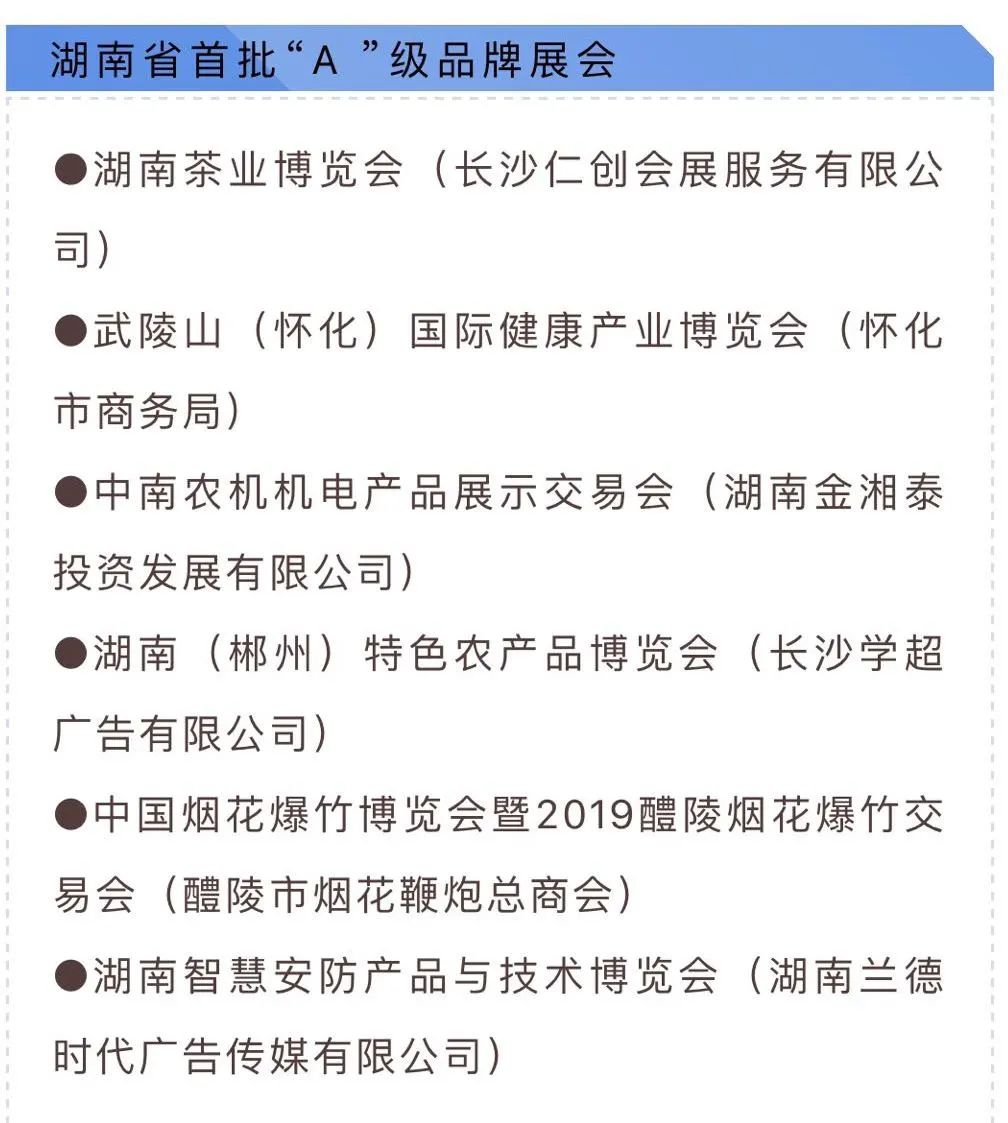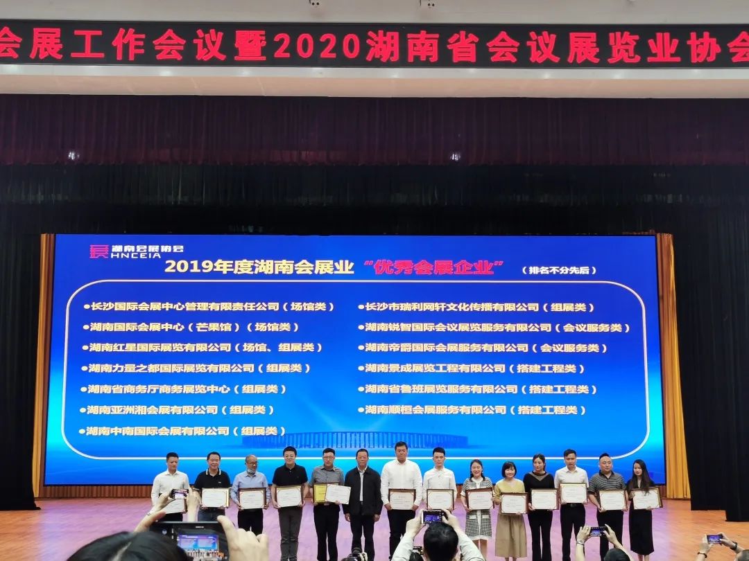 會上表(biao)彰(zhang)了(le)(le) 2019 年度湖南(nan)會展業優秀企(qi)業、領軍人物(wu),宣讀(du)了(le)(le)湖南(nan)省品牌展會(首批)并(bing)舉行了(le)(le)授牌儀式。