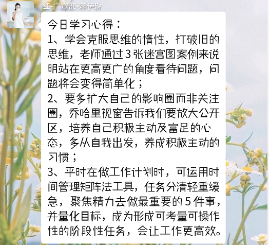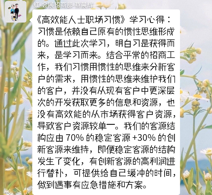 5月(yue)30日,漢碩商(shang)學(xue)院(yuan)MINIMBA23期(qi)第六(liu)期(qi)課(ke)程培訓在長沙紅星國際會展中(zhong)心三樓(lou)多功(gong)能廳開講,來(lai)自漢碩商(shang)學(xue)院(yuan)的(de)趙成(cheng)國老師(shi)為紅星會展中(zhong)、高(gao)層(ceng)骨干開展“高(gao)效能人士職場習慣(guan)”專題(ti)培訓,通過對職場習慣(guan)的(de)多維(wei)度解讀,打開大家的(de)工(gong)作(zuo)思(si)路,提振工(gong)作(zuo)士氣。