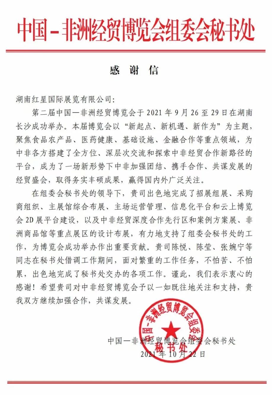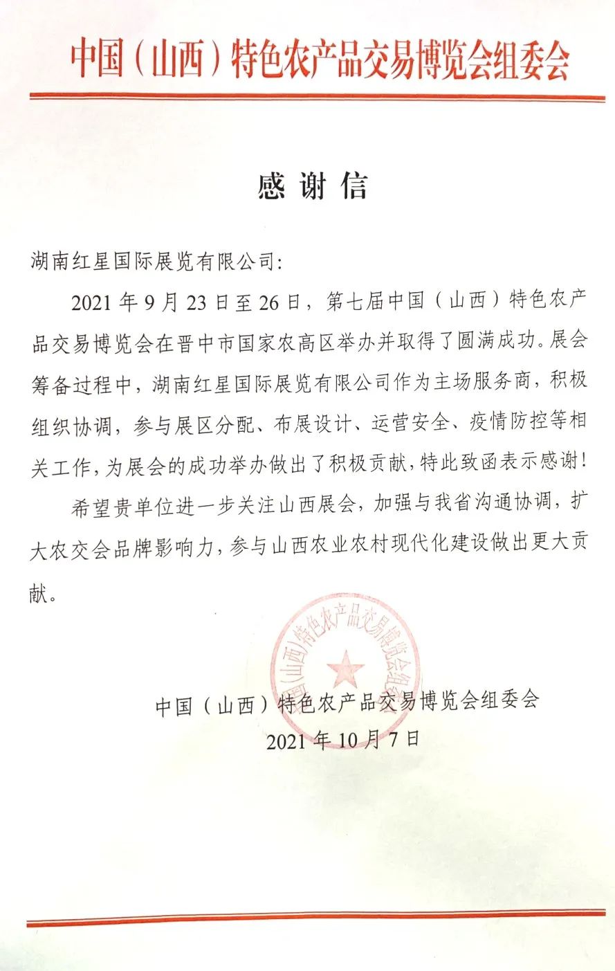 紅星會展發來感謝信