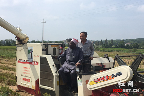 在袁(yuan)氏種業春(chun)華基地,尼日利亞卡諾州州長HE.Dr.Abdullahi Umar Ganduje仔(zi)細(xi)了(le)(le)解了(le)(le)自(zi)動收(shou)割機(ji),并(bing)進行了(le)(le)收(shou)割體驗。