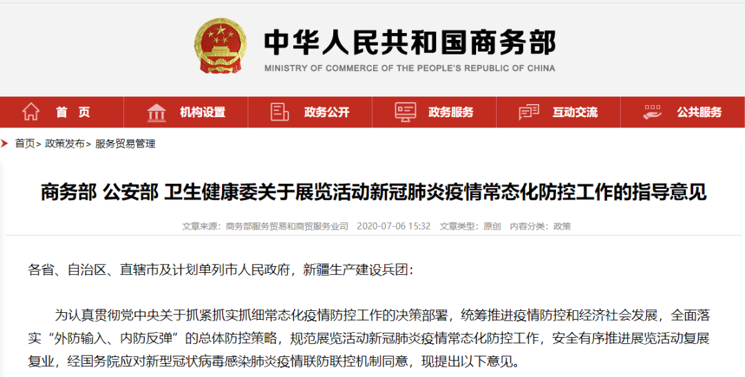 7月(yue)6日(ri),國家商務部(bu)、公安(an)(an)(an)部(bu)、衛生健康委三部(bu)門經國務院(yuan)應對新(xin)型冠狀病毒(du)感染肺(fei)炎(yan)疫(yi)情聯(lian)(lian)防(fang)(fang)聯(lian)(lian)控機制同(tong)意,聯(lian)(lian)合發文,對規范展(zhan)(zhan)覽(lan)活(huo)動(dong)新(xin)冠肺(fei)炎(yan)疫(yi)情常(chang)態化防(fang)(fang)控工(gong)作(zuo)(zuo),安(an)(an)(an)全(quan)有序推(tui)進展(zhan)(zhan)覽(lan)活(huo)動(dong)復(fu)展(zhan)(zhan)復(fu)業提出指導意見(jian),確(que)保我國展(zhan)(zhan)覽(lan)業在保障(zhang)人民群眾生命安(an)(an)(an)全(quan)和身(shen)體健康的前提下(xia),抓(zhua)(zhua)緊抓(zhua)(zhua)實(shi)抓(zhua)(zhua)好(hao)(hao)常(chang)態化下(xia)疫(yi)情防(fang)(fang)控工(gong)作(zuo)(zuo),積極籌備舉辦好(hao)(hao)各類會展(zhan)(zhan)活(huo)動(dong),為推(tui)動(dong)經濟(ji)社會發展(zhan)(zhan)做出貢獻。