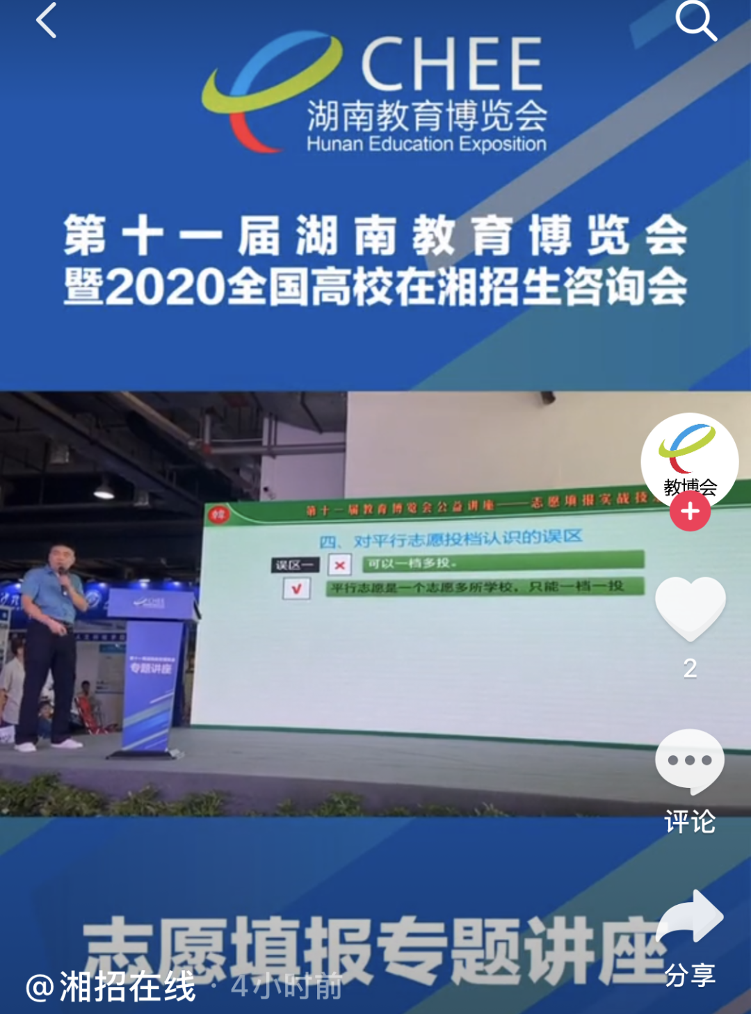 據湖(hu)南(nan)(nan)教育(yu)博(bo)覽會(hui)組委會(hui)介紹(shao),本(ben)屆教博(bo)會(hui)聯合(he)抖(dou)(dou)音共同(tong)發起“湖(hu)南(nan)(nan)報(bao)考直通(tong)車(che)”活動,將講座內容通(tong)過“湘招(zhao)(zhao)在線(xian)”抖(dou)(dou)音號進行直播,在線(xian)解讀2020年(nian)最新招(zhao)(zhao)生政策(ce)。
