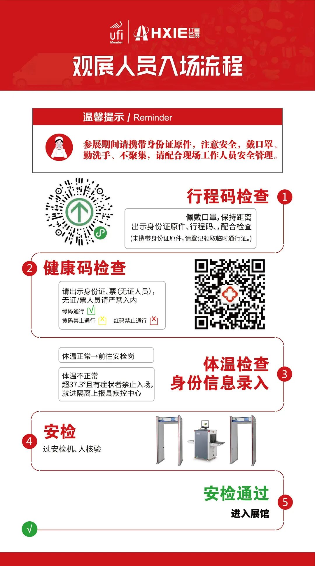 所有參展觀(guan)眾進入(ru)展會現(xian)場前,需持身份證(zheng)原件,戴好口(kou)罩(zhao),現(xian)場掃“行程碼”“湖(hu)南省電子健康(綠碼)”入(ru)場。